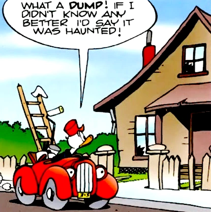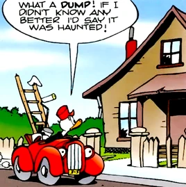 Abandoned in or around 1942, 131313 Gloomy Terrace seems like an ordinary dilapidated old house but is actually haunted by one or several malicious, invisible ghosts or poltergeists. By 1991, Mr Fleasap had come by the house, and, hearing the rumours that it was haunted, Fleasap hired house-painter Donald Duck to give it a fresh coat of paint so as not to scare away potential buyers. Huey, Dewey and Louie attempted to play a trick on their uncle by "fooling" him into thinking he was being attacked by the ghosts, only to themselves have a close encounter with the reals specters; with the nephews distracting the malevolent presences, Donald was able to complete his contract, never the wiser about the truth behind Fleasap's relayed gossip.