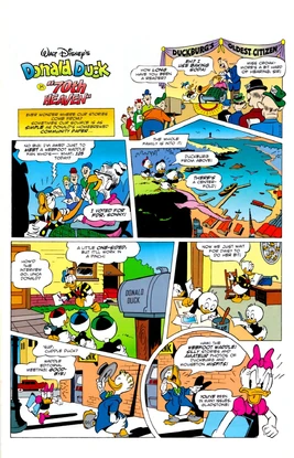 This story was first published on October 23rd, 1992, in the Dutch Donald Duck #1992X43. It was printed in English in Walt Disney's Comics and Stories #715, where, to avoid confusing readers not familiar with the plot device of Donald's story being recounted in comic books in-universe, the Donald Duck book was replaced with a "homebrew community paper" created by Humperdink Duck, called the Webfoot Waddle, meant to celebrate its 70th birthday in that story. While the story avoided mentioning it, the date of a 70th anniversary was, of course, an allusion to the anniversary of Walt Disney's Comics and Stories.