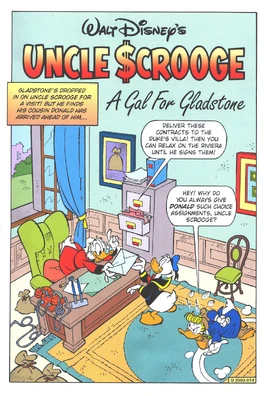 A Gal for Gladstone is a comic story written by Carol and Pat McGreal and drawn by Massimo Fecchi. It features Gladstone Gander, Magica De Spell, Scrooge McDuck, Donald Duck, Ratface, and Miss Quackfaster.