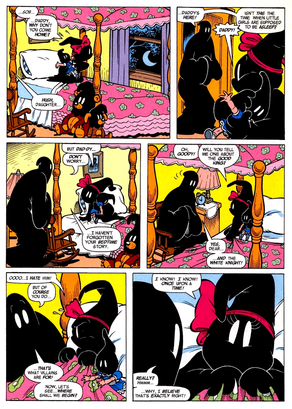 The Phantom Blot, following his presumed death at the end of the Case of the Two-Birds Diamond, lured Mickey Mouse into a crazy, devilish and escherian room full of traps in his most elaborated death trap of all times. Of course, Mickey succeeds and the Blot is arrested… but the mastermind finally reveals his greatest secret — the existence of his young daughter. Before he takes him to jail, Mickey thus allows the Phantom to tell his daughter the news his own way, in a bedtime story where he is the Good King of the Night and Mickey is the evil White Knight.
