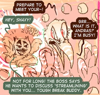 Andras is an owl-like demon whose specialty is to idly spread discord among people — be they mortals, or demons themselves. He occasionally acts as a messenger between the Devil and lower demons such as Shax.