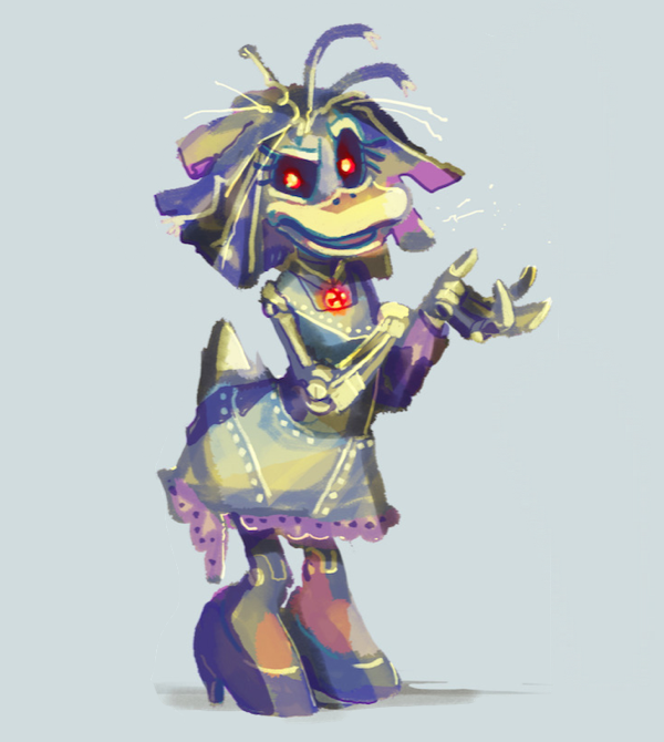 Along with a number of other similar animatronics, Animatronic Magica was created by the Mad Doctor in the early days of Wasteland at the request of Oswald Rabbit, as Oswald sought to have everything that Mickey Mouse had — down to his many friends and acquaintances. Though she has no delusions of being the real Magica, Animatronic Magica is, like the Doctor's other creations, a very thorough copy of the real thing, sharing most of her core personality. Animatronic Magica was designed with the ability to breathe fire (much like the Disneyland animatronic representing Maleficent's dragon form), but, much like the others of the Doctor's Animatronics, quickly became very run-down as a consequence of the Doctor's betraying Oswald. As a result, on top of a lot of her paint having peeled off to reveal the metal beneath, this fire-breathing ability is usually reduced to just smoke and some sparks.