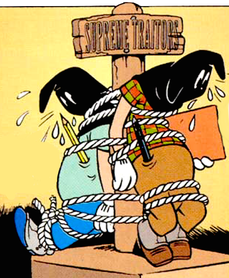 The Authors appears in the notorious 1949 story Mickey's Inferno. The metafictional implication is that they are none other than Guido Martina and Angelo Bioletto, the writer and artist of Mickey's Inferno itself, though such fourth-wall-breaking is best left untangled with, the default assumption taken on this Wiki being that the Authors were simply incomprehensible hallucinations within Mickey's dream.