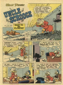 Back to the Klondike is a comic story written and drawn by Carl Barks. It features Scrooge McDuck, Donald Duck, Huey, Dewey and Louie Duck and in her debut, Goldie O'Gilt.