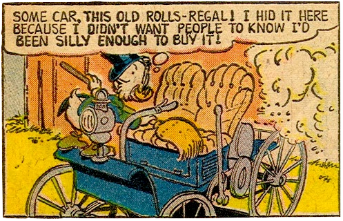 - Carl Barks reused the idea of Scrooge owning an antique car a few years later in Chugwagon Derby (1961), where he reveals the car to be a Rolls-Regal Horseless Shay. Don Rosa would then show the Shay brand-new in The Empire-Builder from Calisota (1994), the tenth chapter of his Life and Times of Scrooge McDuck. However, the Horseless Shay has a markedly different design from the old car seen here, and its circumstances in the 1961 story leave no room for Scrooge to have taken it for a ride, let alone bought spare parts for it, in 1958. At any rate, a pin featuring Scrooge driving a car similar to the 1958 model was released in 2004.