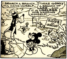 Goofy, Clarabelle Cow, Peg-Leg Pete and Mickey Mouse once lived near a branch of this lake, seemingly placing it near Mouseton and thus (by implication) in Calisota. It was located not far from Resegon Mount and inhabited by ducks, among other things. Shortly after Goofy was romantically rejected by Clarabelle, who was, at that point, married, he attempted to leave town via aeroplane only to sink his plane into the Lake almost immediately.