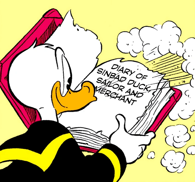 The Diary is a document concerning Sinbad Duck, an ancestor of Donald Duck, and records his fantastical voyages up until his marriage to Deysi, at which point the book, ended, although acknowledging that Sinbad and his bride lived through many other adventures together in later years. Despite occasionally referring to Sinbad in the third person, the book was apparently written by Sinbad himself. By 1985, it had ended up inside Scrooge McDuck's personal library in his Money Bin, where Donald Duck found it and read through it upon being hired by Scrooge to dust the library.