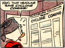 One of Duckburg's many local newspapers, the Agitator was one of the newspapers which, at the end of the summer of 1971, predicted an incoming cyclone. Huey, Dewey and Louie Duck and the other Junior Woodchucks of their troop, who had been camping out in the woods in the days leading up to the cyclone, had not been made aware of this, and ended up convinced that their attempt at a Guidebook-aided raindance had been responsible for rousing the freak storm, until they stumbled upon the issue of the Agitator whose headline spoke of the cyclone, which eased their conscience.