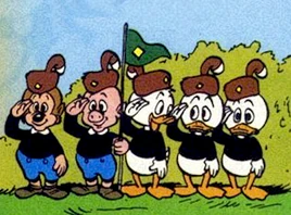 First identified as "Duckburg Burrow Number 13" in October of 1951 in Ten-Star Generals, Huey, Dewey and Louie Duck's Junior Woodchucks troop is a recurring element in Junior Woodchucks stories, with its own recurring cast of familiar faces, including a young pig named Holsworthy Hog and a young fox named Field Marshal Fox. Newton Gearloose and Li'l Bad Wolf are also occasionally shown as belonging to the same troop as Huey, Dewey and Louie.