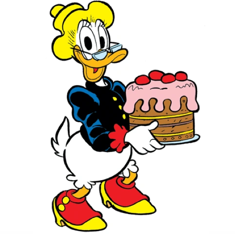 Her first appearance was nearly six years later in August 1940 in the comic strip entitled Buried Money, though whether or not this counts as a true "physical appearance" is debatable as she only appears in a photograph on Donald's wall. This strip further confirmed that she was indeed a relative of Donald's. Her first true physical appearance came a full nine years almost to the date after her name first appeared in print, in a Donald Duck comic strip released on September the 27th, 1943. She appeared in multiple strips afterwards and soon began to star in full-length comics. She has become a major recurring character in Donald Duck comics and has even made a few appearances in animation starting with her animated debut in This Is Your Life, Donald Duck in 1960.