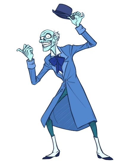 Phineas, a lanky skeleton with a predatory grin, is one of the Haunted Mansion's happy haunts — specifically, one of the three Hitchhiking Ghosts. As with many of the Mansion's inhabitants, Ezra's biography and circumstances of death are the subject of a thousand contradictory rumors, though it is believed he is the brother of the Hatbox Ghost (due to their sheer resemblance). Ezra appears to be buried in the Mansion's family plot, his being a gravestone simply bearing the name "Ezra", with neither a last name or an epitaph.