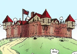 However, as the colony became a small town, people stopped living in the fort and built their own houses, resulting in Fort Duckburg being abandoned once again. The earliest Junior Woodchucks did use it as a meeting place, but it didn't stop it from falling into disrepair. In 1902, Scrooge McDuck, who had bought Killmule Hill, had the fort dismantled, its parts scattered in various warehouses, to build his first Money Bin on the newly-renamed Killmotor Hill in its place.[5] Only in 1951, thanks to Junior Woodchucks Huey, Dewey and Louie Duck and their uncle Donald, would the parts be gathered once again and the Fort be rebuilt near the Black Forest. Fort Duckburg, now a tourist attraction, was later used as a scenery for a movie about the Western Frontier.
