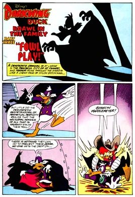 Fowl Play! is a comic story scripted and penciled by John Blair Moore, and inked by George Wildman, adapting the third quarter of Darkly Dawns The Duck (cartoon), whose script was by Tad Stones, Jan Strnad and Jymn Magon. The third chapter of Brawl in the Family, it features Darkwing Duck, Taurus Bulba, Tantalus, Launchpad McQuack, Gosalyn Mallard, Hammerhead Hannigan, Hoof and Mouth, Clovis, and a picture of Professor Waddlemeyer.