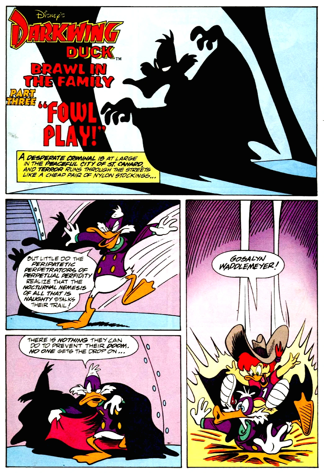 Fowl Play! was printed in Jnauary of 1992 in the third issue of a Darkwing Duck limited comic series devoted solely to the publication of Brawl in the Family’s four chapters.