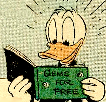 Gems For Free is a guidebook to hunting for gems in the American wilderness. Huey, Dewey and Louie Duck owned a copy by 1952, leading their uncle Donald to use it when he wanted to prove himself superior to Gladstone Gander (who had recently found a diamond in Duckburg Park). The book gave information on how to recognise gems and on where to find them, but failed to lead the Ducks to fortune.