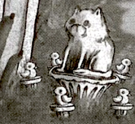 These five birds met their fate in the 19th century in the jaws of one of the cats owned by the mortal masters of Gracey Mansion. They were comically buried in a circle around the cat himself, as if mobbing around him in a thirst for justice. Indeed, the Cat's ghost is somewhat obvious to this, the five diminutive ghosts do in fact bear him a terrible grudge and never miss an opportunity to peck at him.