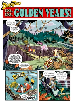 Go, Go, Golden Years! is a DuckTales 2017 comic written by Joey Cavalieri and drawn by Andrea Greppi, Cristina Stella, Emilio Urbano ad Michela Frare. It features the 2017 Continuum versions of Donald Duck, Scrooge McDuck and Huey, Dewey and Louie Duck, and, in their debuts, Doctor Quackmire Quantum, Rip Van Wrinkle and the Headhunters. Ernest Henintheway is mentioned.