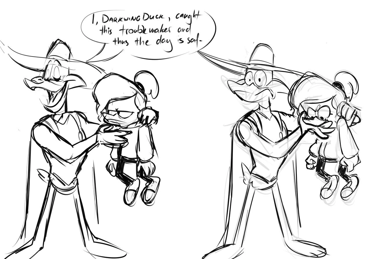 Drake Mallard (in full Darkwing Duck regalia) has caught trouble-making Gosalyn Mallard. But is it over?