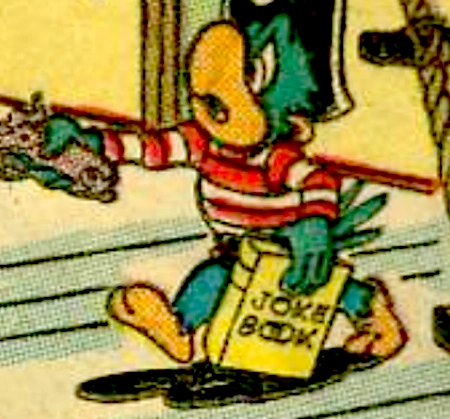 During the Crimson Crate’s voyage to Nothing Atoll, Grimhilde, as part of her efforts to build up distrust between the Seven Dwarfs and skipper Yellow Beak, planted this joke book on Happy while he was supposed to be watching from the crow's-nest. Yellow Beak indeed caught him with the book and threw him in the brig, confiscating the book.