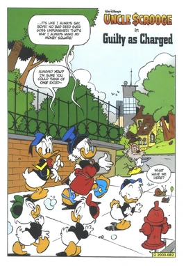 Guilty As Charged is a comic story written by Paul Halas and drawn by Miguel Fernandez Martinez. It features Scrooge McDuck, Donald Duck, Huey, Dewey and Louie Duck, Gyro Gearloose, the Little Helper and Grasper Gribley. An imaginary mental image of Napoléon Bonaparte is seen.