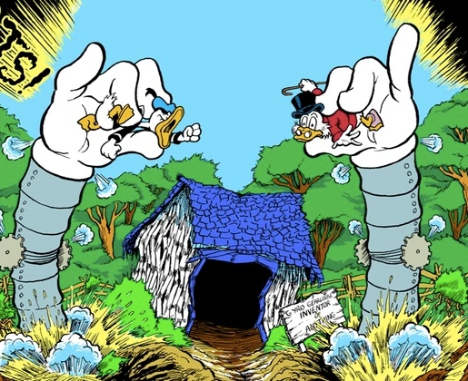 This security system consisting of huge robotic arms unearthing themselves from the foundations of the building was built around his lab by Gyro Gearloose in 2020, although he promptly forgot about it — and forgot to warn Scrooge McDuck and Donald Duck, who fell afoul of the mechanical bouncer when they visited Gyro hoping he could help them rescue Huey, Dewey and Louie Duck from Professor Van Hydroolik's clutches. Scrooge successfully destroyed it using a trick he had learned in his Klondike days to destroy Soapy Slick's steam-paddler.
