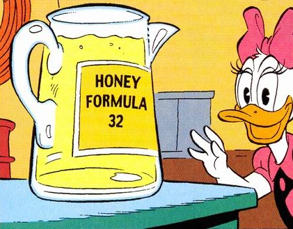 Honey Formula 32 was developed by Gyro Gearloose in an attempt to make use of houseflies by turning them into honeybees. While visiting Gyro to get her toaster fix, however, Daisy Duck confused the honey-like substance for actual honey and made the mistake of tasting it. As a result, it came to light that the Formula could transform any and everything into bees, not just houseflies.
