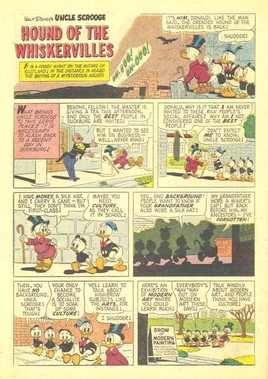 Hound of the Whiskervilles is a comic story featuring Scrooge McDuck, Donald Duck, Huey, Dewey and Louie Duck, Angus McWhisker and the titular Hound.
