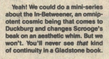 The In-Betweener was created by an editor at Gladstone in the letters column of Uncle Scrooge #223 as a joke response to a reader's concern that Don Rosa, whose first story had recently been published, might add continuity to Disney comics.
