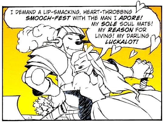 A "living drawing" created by Huey, Dewey and Louie Duck using magic ink, Maid Lovelorn was meant to be the typical romantic-minded princess, in love with Knight in Shining Armor Sir Luckalot. Soon after coming to life, however, Luckalot and Lovelorn berated the preteens for not letting them so much as kiss in their overly-chaste attempt at a romance plotline. Luckalot let slip that she would be fine with kissing "anyone", whether Lovelorn or someone else, which angered Lovelorn.