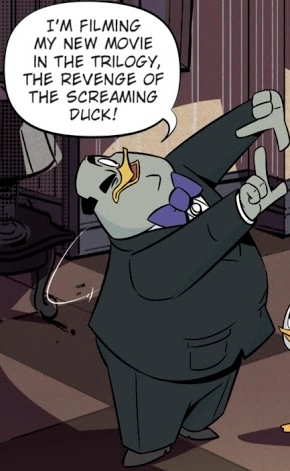 However, his perfectionism delayed his final film, The Revenge of the Screaming Duck, by many years as his insane demands drove away all cast and crew. Hiding out in the lonely Eagle's Pinky Toe Hotel, the mad moviemaker set out to complete the movie all by himself, a naturally impossible task. When Donald Duck and his nephews Huey, Dewey and Louie Duck visited the hotel, he accepted their help, hiring Dewey for the part of the Screaming Duck. An unwitting Donald Duck acted as the scared protagonist as the disguised Dewey, special effects in tow, chased him screaming and shrieking through the hotel.