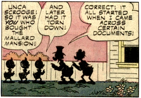 Mallard Mansion was once the home of Mallard, a wealthy Duckburger with a flair for the dramatic. Mallard hid a map to his treasure somewhere in the Mansion (in point of fact, inside one of the andirons), and recorded this fact in mysterious documents which Scrooge McDuck came across some time after Mallard's death. Scrooge, looking for the map to the Mallard Treasure, bought Mallard Mansion and had it torn down piece by piece. However, he missed the andiron in the process, and abandoned the ruins of the Mansion until finally, in 1976, his grandnephews found the unassuming artifact by chance while playing in the ruins.