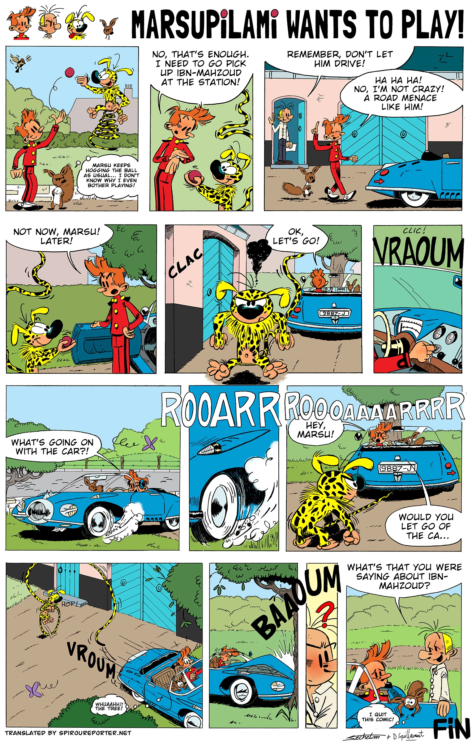 Spirou tries to drive away from the house to visit Ibn-Mah-Zoud, but a playful Marsupilami won't let him…