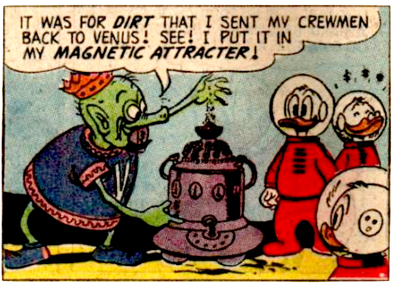 When Muchkale travelled to the Golden Moon "seven hundred years before Scrooge McDuck was born", it was with a Magnetic Attracter and a group of loyal crewmen. However, shortly after arriving, Muchkale realized they had forgotten to pack any seed dirt to feed the Attracter to make it produce foodstuff. He sent his crew back aboard his ship, but it never returned, stranding Muchkale on the Moon for hundreds of years. Learning of the story, Huey, Dewey and Louie Duck speculated that the ship had hit an asteroid on the way to Venus and the crew had perished.