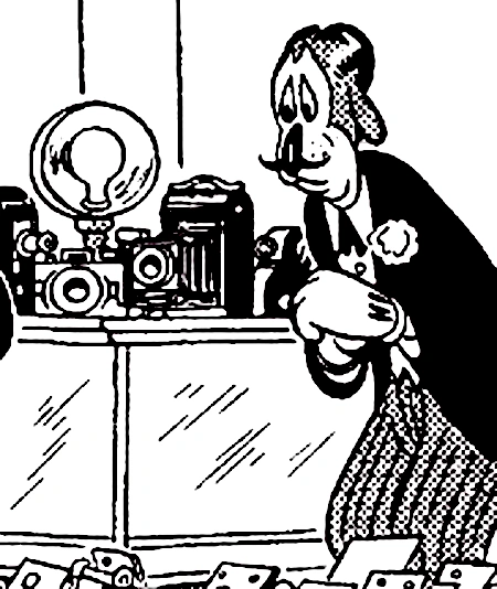 In 1939, Muggins' Department Store on East Main Street in Mouseville was one of the shops selling the model of cameras that was obsessively tracked down, stolen and smashed by the Phantom Blot in his secret efforts to find a secret formula hidden in one of the individual cameras. It was, therefore, attacked in the night by the Blot. When Mickey Mouse arrived at the store himself to help with the investigation, he found the distraught Muggins — a thin, anxious-looking man with a black mustache — standing in the pile of his broken products.
