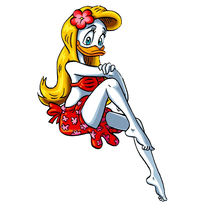 After nearly drowning in a shipwreck in the Pacific in the mid-1930's, Donald Duck woke up safe and sound on the beach of an atoll, being tended to by a mysterious blonde-haired woman with a penetrating gaze. She claimed to be a local pearl-fisher, and had, at any rate, rescued him after observing his bravery.