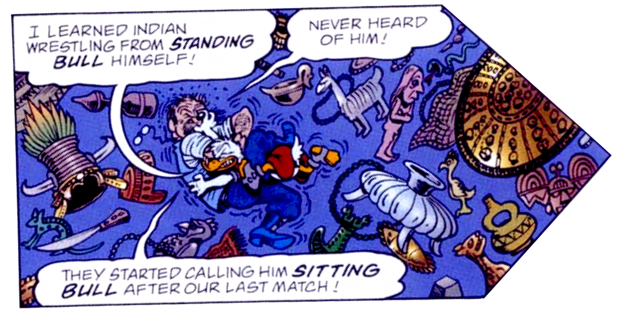 By 1906, Sitting Bull was known as a famous Amerindian chief. As they fought for ownership of the Stone Jaguar, Scrooge McDuck told Theodore Roosevelt that he had learned "Indian wrestling" from Sitting Bull, then Standing Bull, and had reduced him to changing his name to ‘Sitting’ Bull after their last match, the student having surpassed the teacher.