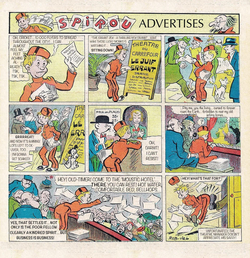 Forced to give out 10,000 flyers advertising the ‘Moustic Hotel’, Spirou is caught by the rain and heads into a theatre to further his advertising.