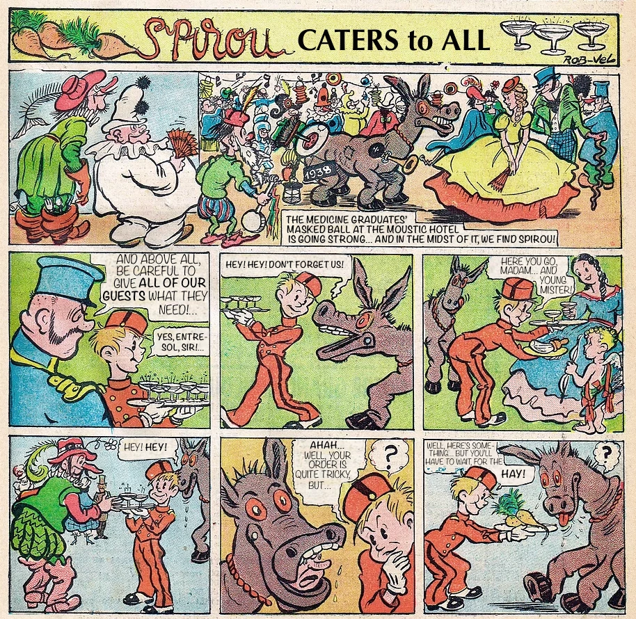 Spirou Caters to All (Spirou Soigne ses Clients in the original French) is a comic one-pager possibly written by Rob-Vel, and drawn by either him or Luc Lafnet. It features Spirou and Entresol.