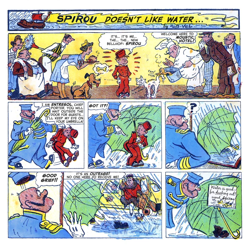 Spirou Doesn't Like Water (Spirou n'aime pas l'eau in the original French) is a comic one-pager possibly written by Rob-Vel, and drawn by Luc Lafnet. It features Spirou and, in his debut, Entresol.