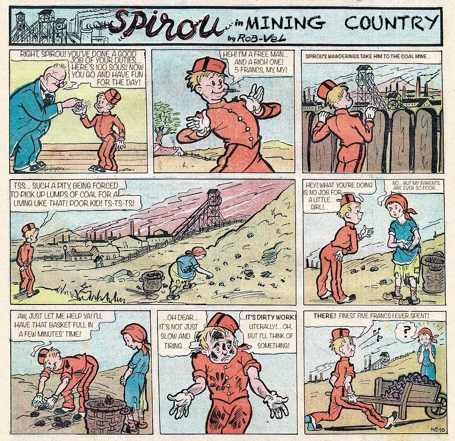 Spirou in Mining Country (Spirou au Pays Minier in the original French) is a comic one-pager possibly written by Rob-Vel, and drawn by either him or Luc Lafnet. It features Spirou and M. Papillon.