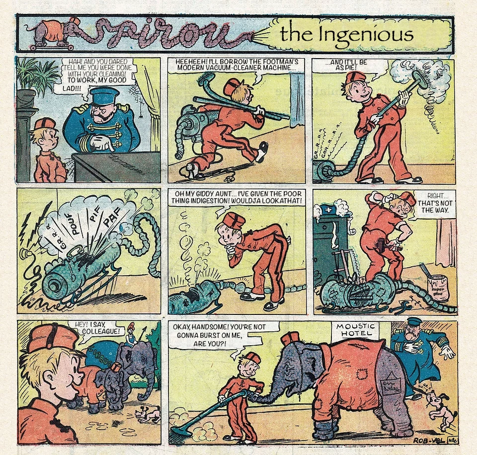 Spirou is told by Entresol to double down on the cleaning. He borrows a (then-)cutting-edge vacuum cleaner, but ends up breaking it. What to do next?
