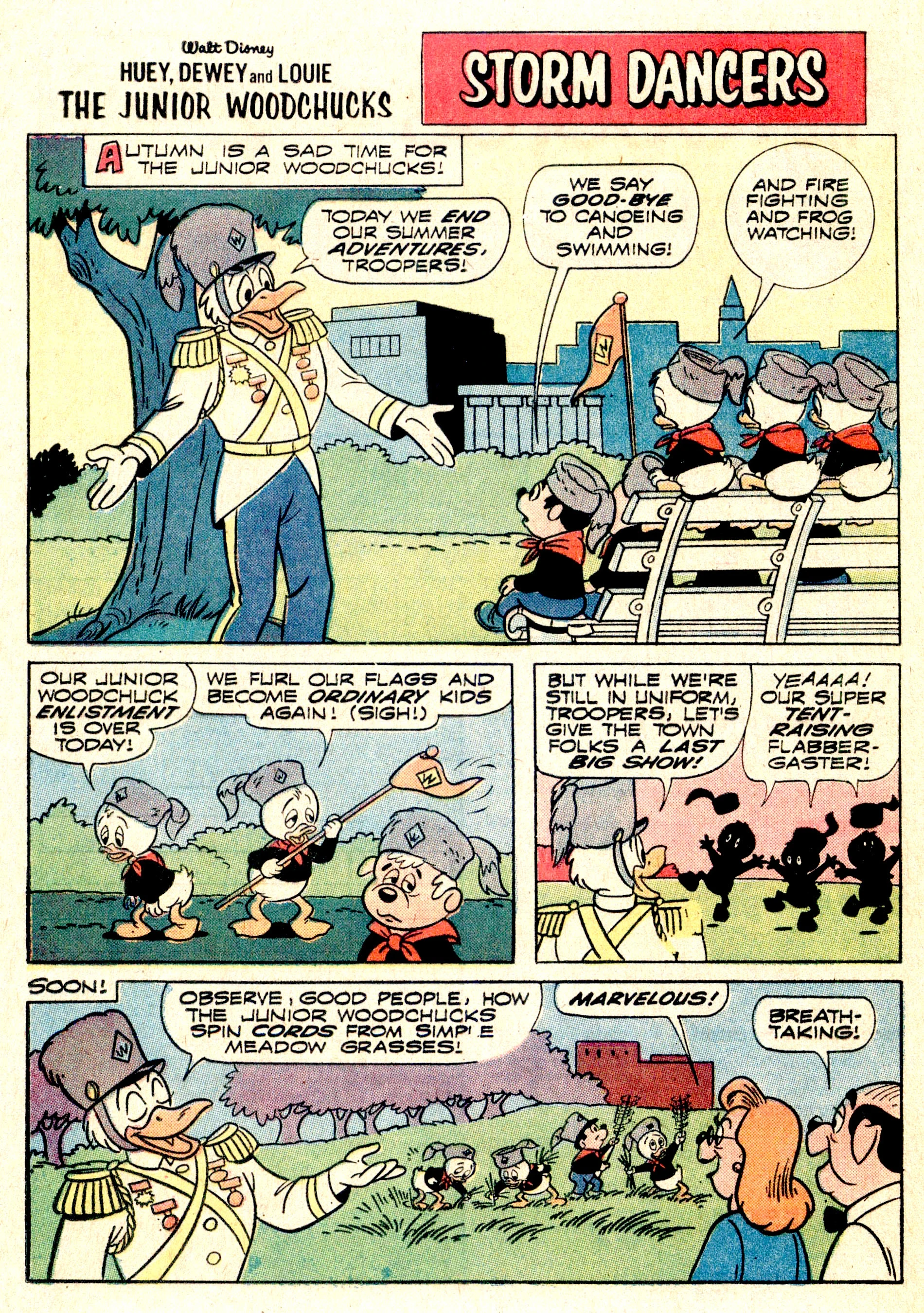 As summer comes to a close, Huey, Dewey and Louie Duck are loathe to give up on daily Junior Woodchucking to instead go back to school. Using their Guidebook's chapter on rain-dances, they and a few of their fellow troopers scheme to cause a downpour that will get the next day's classes canceled, but they soon get more than they bargained for…