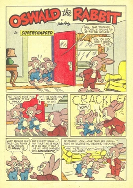 Supercharged is a comic story drawn by Jack Bradbury. It features Oswald Rabbit, Lloyd and Floyd Rabbit and (in their debut) Butchie and the Cueball Twins.