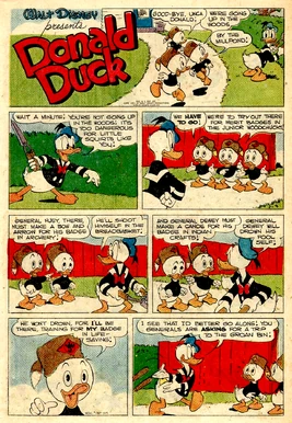 - This story was the second tale to feature the Junior Woodchucks, debuted earlier in the year by their creator Carl Barks in Snowbound Hound (1951). As such, it set up a number of facts about the organisation, such as the basic look of their outfits and Huey, Dewey and Louie's status as high-ranking "generals" within its cod-military, meritocratic hierarchy.