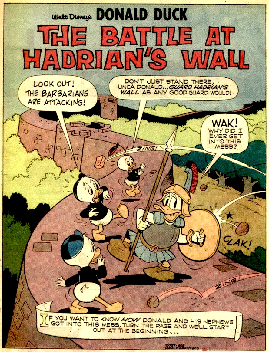 The Battle at Hadrian's Wall is a 1966 comic story written by Vic Lockman with art by Tony Strobl and Steve Steere.[1] It features Donald Duck, Huey, Dewey and Louie Duck, Gladstone Gander, and, in their debuts, the Lepra-Duck, J.P. Pile, Mrs Pile, the Pile Kids, Hadrian, and Titus. Early members of the Clan McDuck appear.