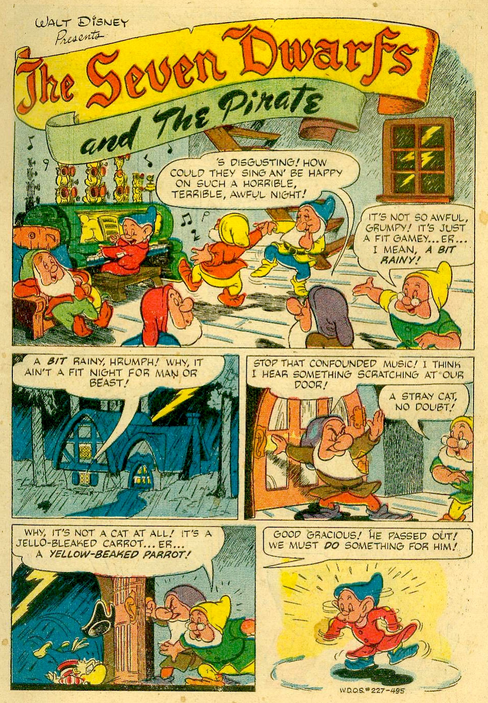 The Seven Dwarfs and the Pirates was the third comic reincarnation of the unfinished 1939 feature film Morgan's Ghost, released in 1949 in Four Color Comics #227. It would later be reprinted in English in One Shot #19.