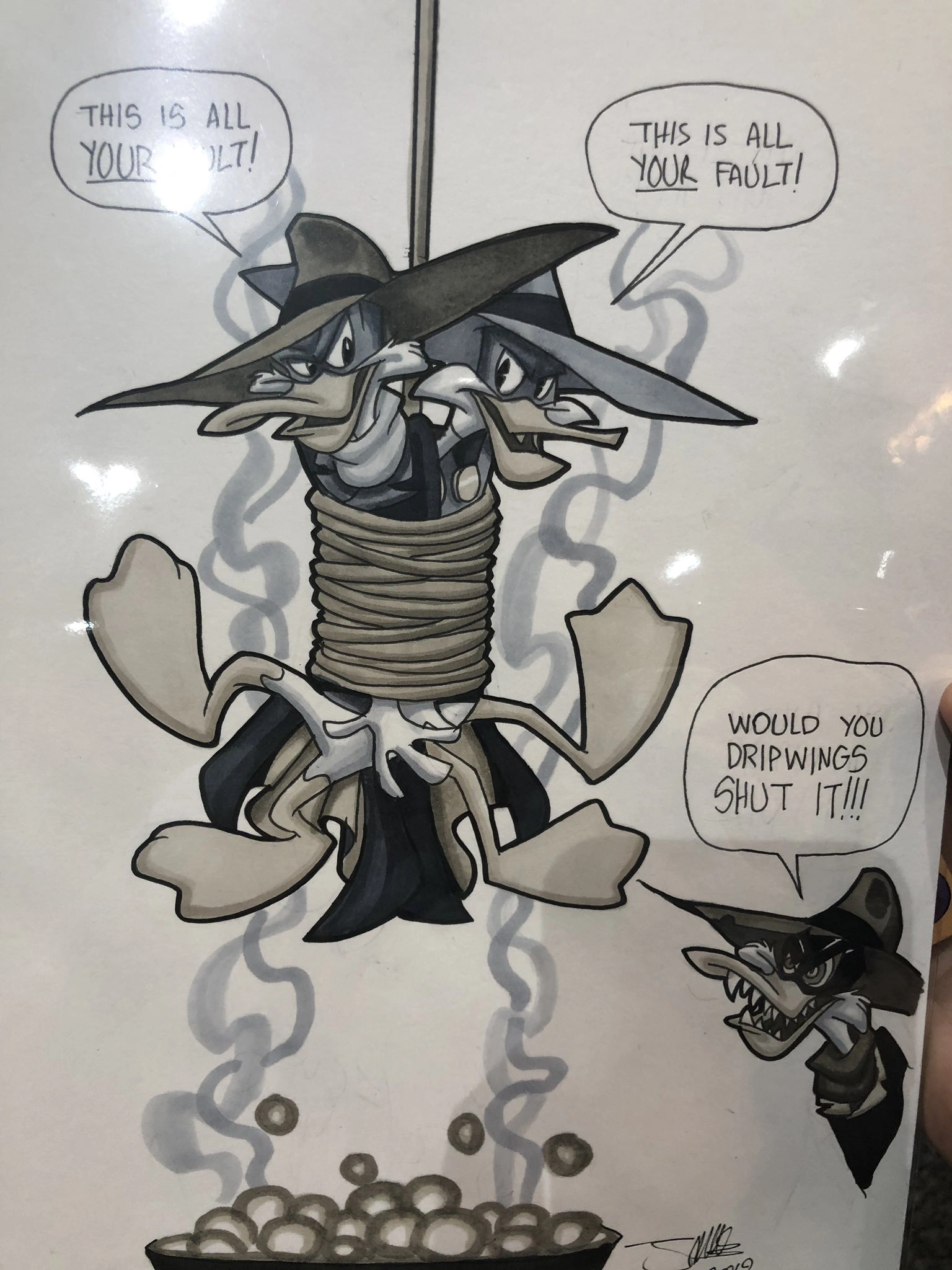 This unlikely crossover was drawn by James Silvani at the 2019 San Diego Comic Con at the request of podcaster “Nola Nerdcast”, who soon posted it on Twitter.