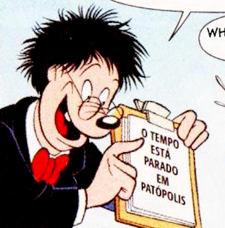 Time Has Stopped in Duckburg was the book Professor Batty wrote compiling his studies of the curious fact that most people in Duckburg had, by 2014, not aged a day since the 1950's, yet didn't seem to question or even realize this startling fact. It also included copious material on Batty's pet theory that this was a side-effect of most prominent Duckburgers' lives being told as comic-books — the idea seemingly being that there was a sort of feedback effect in place where the comic-book convention of an unchanging, never-questioned status quo ended up influencing the real world.