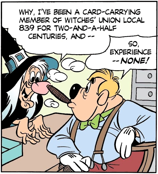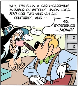 It is known from the horse's mouth that by 1963, Witch Hazel had been a member of the Union for "two and a half centuries", specifically belonging to its "local 839". On the other hand, it can be inferred that numerous witches did not belong to the Union from the fact that they were observed to seek out and possess mortal money. They include Grimhilde.